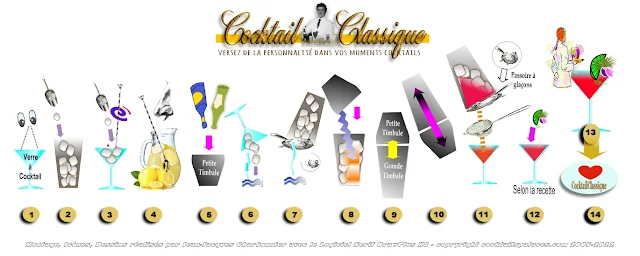 - Frapper* (Frapper*: Secouer énergiquement le mélange dans le shaker pendant 15 à 20 secondes, dans un mouvement de vas et viens, souple et élégant, les glaçons venant frapper alternativement le fond de chaque timbale).